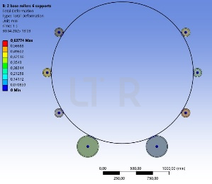 Для обеспечения точной геометрии обечаек наши инженеры выполнили прочностные расчеты в ANSYS, определив оптимальные усилия прижима роликов, которые исключают деформации обечаек как от провисания под собственным весом, так и от термических нагрузок при сварке.